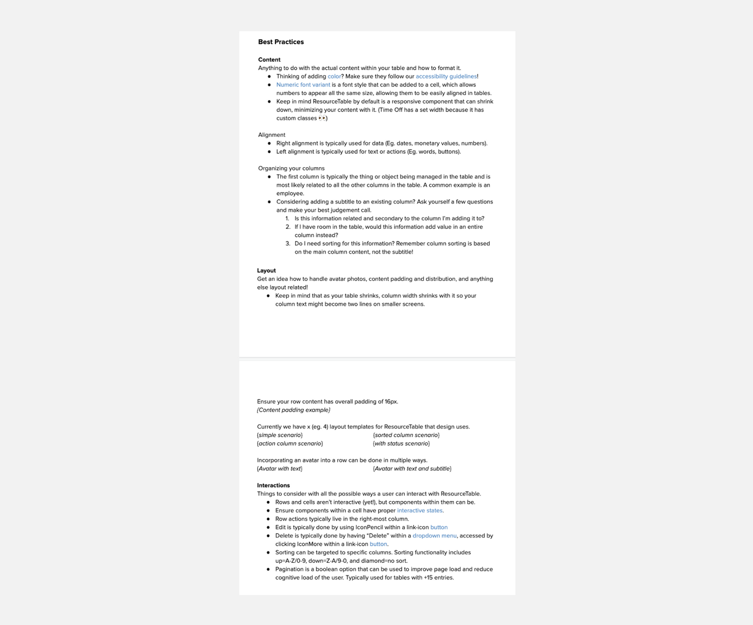 As I reviewed each table I left notes of things like functionality and layout usage to ensure the new component covered our needs, while also noting things that could be consolidated to simplify it's usage and speed up dev time creating it.