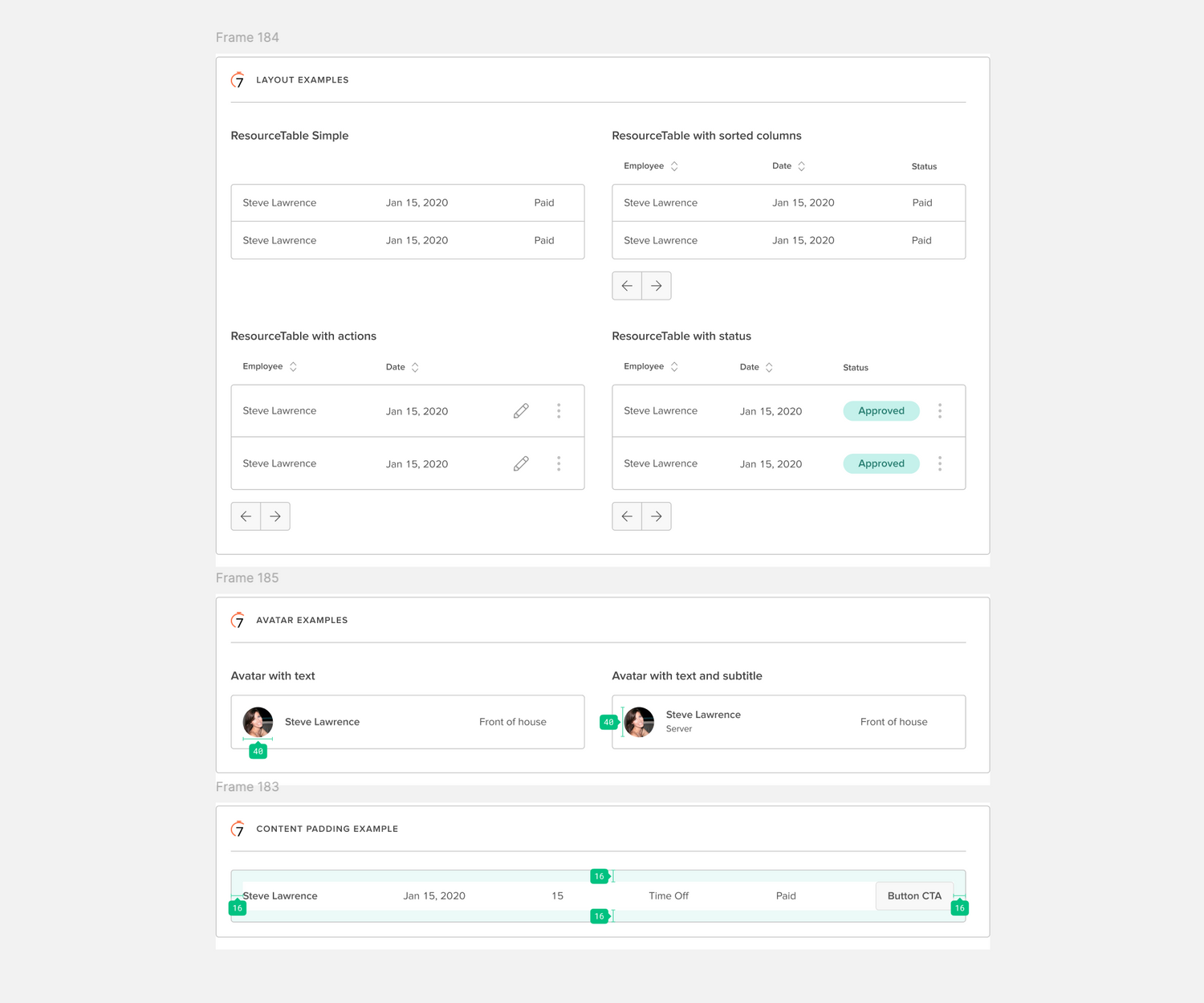 After researching how other design systems did tables as well as how we were using tables, I created some mocks and shared with the design team to start the review process. Once I made some revisions based on feedback we were left with these common use cases.