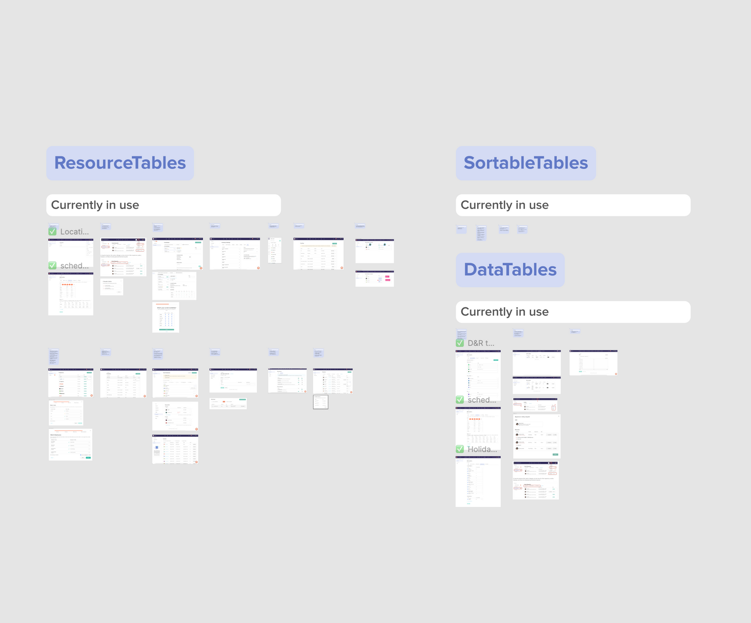 In order to create the first component, we needed to understand what and how to build it first. We decided on building a table because tables were commonly used but the usage in code and design wasn't super clear or easy to use (i.e. existing design + tech debt). There was three different, yet almost identical tables to get an idea of the problem.