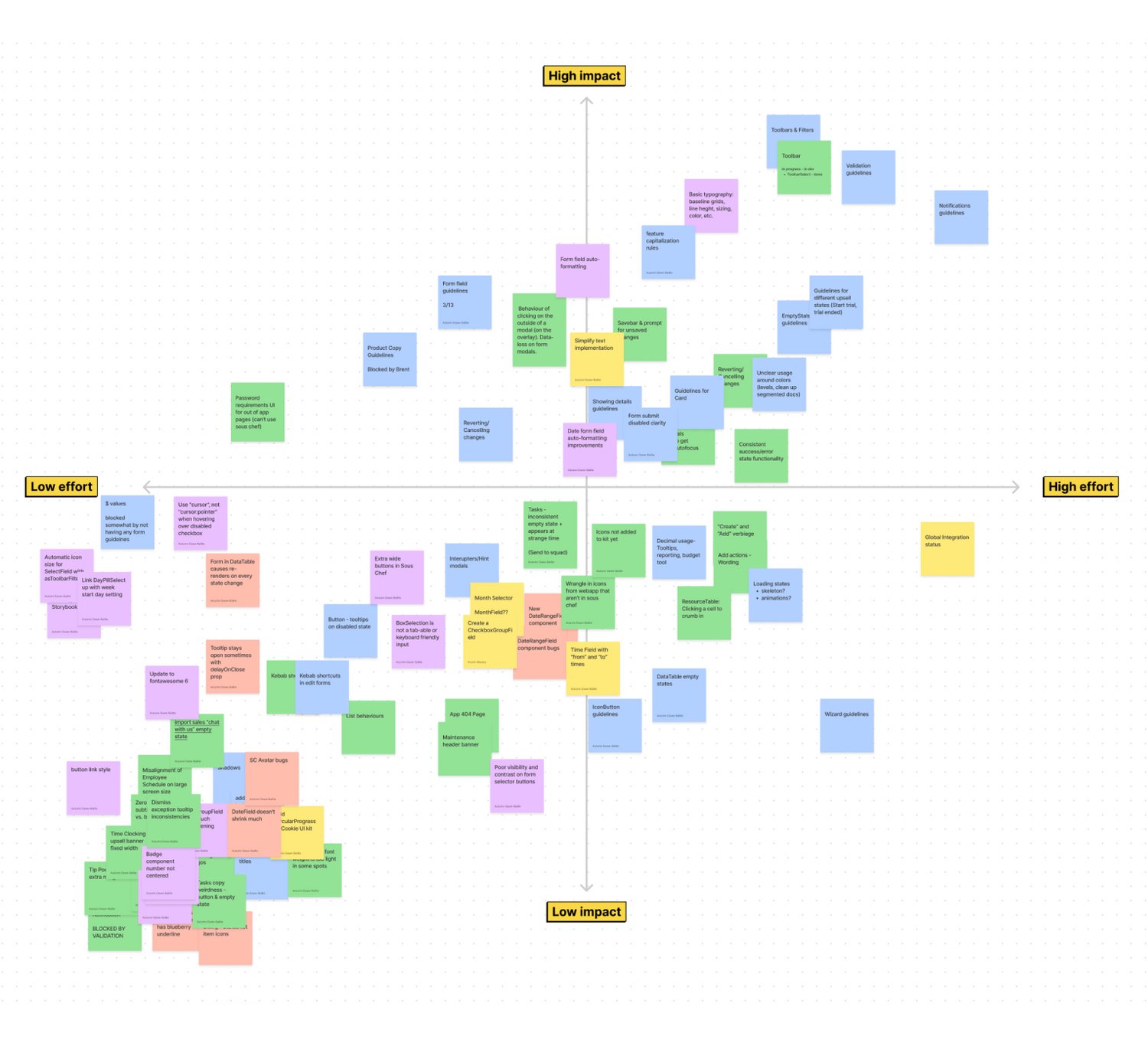 Sticky colours helped organize the categories for each type of task. The categories were: guidelines, design debt, bugs, enhancements, and new components. Every few months we'd review the matrix to determine if any stickies needed to be re-adjusted.
